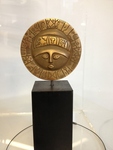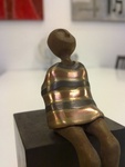 2010Handgemaakt van gesinterd brons, koper en staal. Figuur ongepolijst, cape gepolijst. Voet: rubberblok zwart 10x10x5 cm.